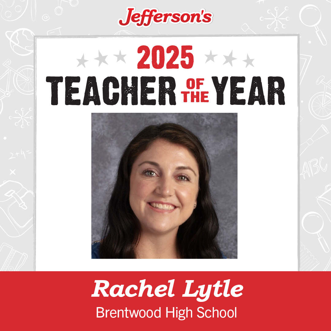 Congratulations to Rachel Lytle, our 2025 Jefferson’s Brentwood Teacher of the Year!