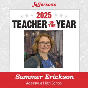 Jefferson’s of Adairsville is pleased to announce that Summer Erickson has been named the first-ever Jefferson’s Adairsville Teacher of the Year! Mrs. Erickson has been a teacher for 21 years, and currently teaches US History and Psychology to 10th – 12th graders at Adairsville High School.