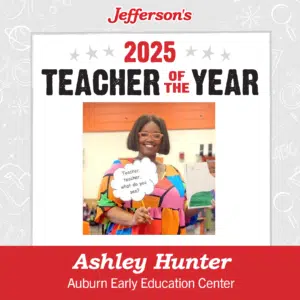 Jefferson’s of Opelika is pleased to announce that Ashley Hunter has been named the first-ever Jefferson’s Opelika Teacher of the Year! Miss Hunter teaches second grade at Auburn Early Education Center. She has been teaching for nine years.
