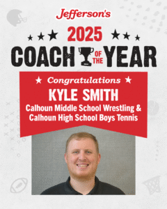Jefferson’s of Calhoun is pleased to announce that Kyle Smith has been named Jefferson’s Calhoun Coach of the Year. Smith coaches wrestling at Calhoun Middle and boys’ tennis at Calhoun High. He has been coaching for five years.