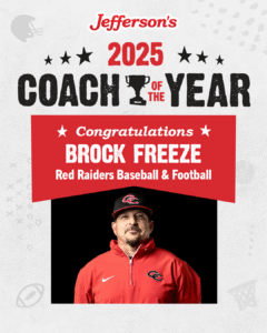 Jefferson’s of Manchester is pleased to announce that Brock Freeze has been named Jefferson’s Manchester Coach of the Year. Freeze coaches football, softball, and baseball at Coffee County Middle and High Schools, and has been coaching for 20 years. Coach Freeze has also been a history teacher in the Coffee County system for 25 years.
