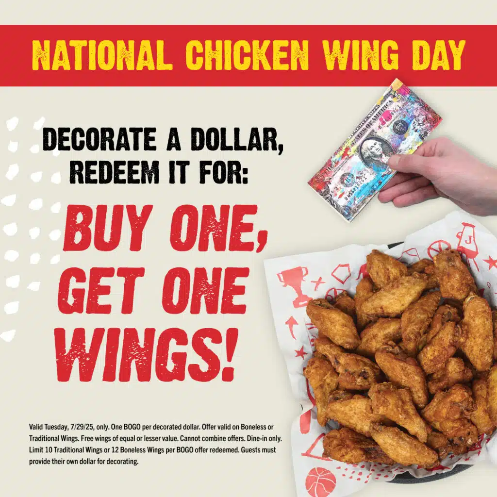 July 24, 2025 – In honor of National Chicken Wing Day on Tuesday, July 29, Jefferson’s Restaurant is offering its guests a chance at free wings! Patrons who visit on July 29 and provide a decorated one-dollar bill can redeem their dollar for Buy One, Get One wings.