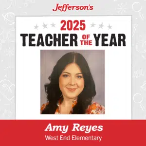 Ms. Reyes will receive a $500 gift card to Jefferson’s, and her achievement will be commemorated with a “Jefferson’s Teacher of the Year” plaque for all restaurant patrons to see.