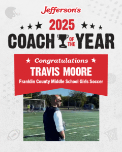 Jefferson’s of Winchester is pleased to announce that Travis Moore has been named Jefferson’s Winchester Coach of the Year. Moore coaches soccer for Franklin County Middle School and club soccer at Camp Forest, and has been coaching for eight years.
