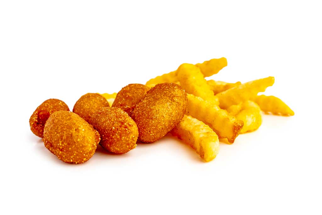 A basket of mini corn dogs fried to perfection. (390 cal)