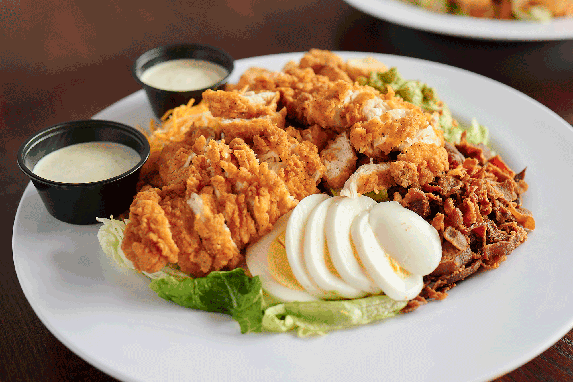 A house specialty! Dill pickle chips hand-breaded & fried to perfection, served with your choice of ranch or blue cheese dressing (1060/1140 cal)