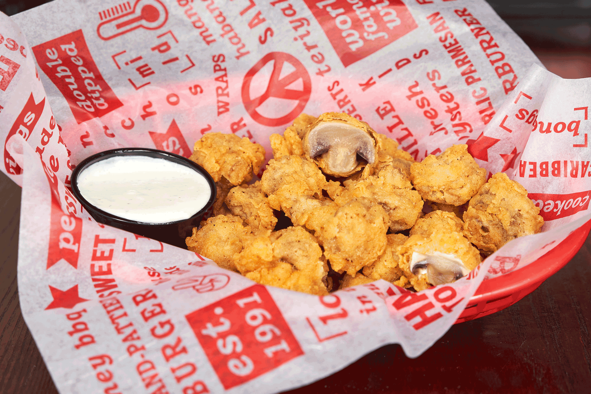 Hand-breaded mushrooms served with ranch or blue cheese (740/820 cal)
