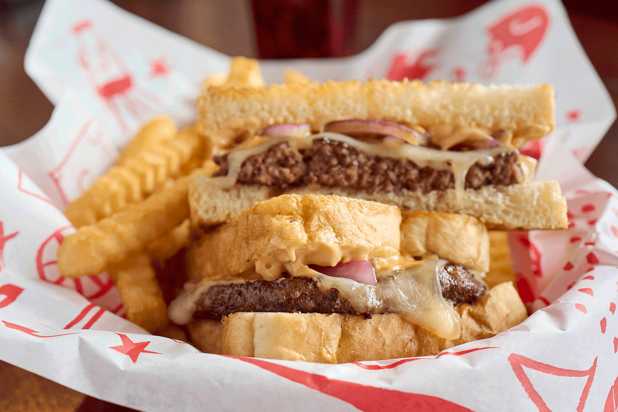 Two patties smothered in sautéed onions, peppers and mushrooms, served with 2 main sides & Texas Toast. (1100-1430 cal)