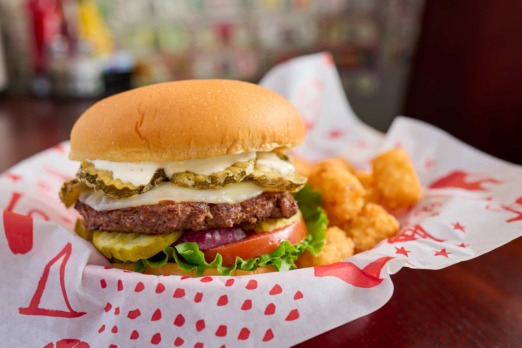 Grilled or hand-breaded chicken with Provolone cheese, our famous fried pickles, house-made ranch, lettuce, tomato, onion, & pickle on a Martin’s Potato Bun. (680/930 cal)