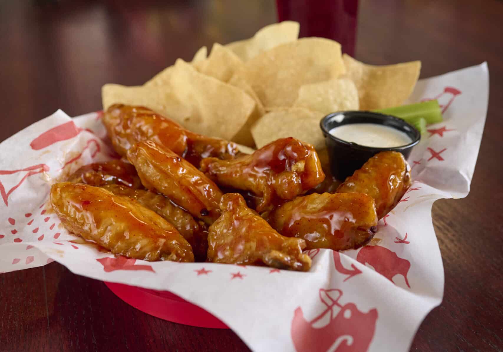 Our World Famous Wings in your choice of signature sauce. Wings are available in orders of 5, 10, 15, 20, 30, and 50. Comes with celery, chips, and your choice of dressing. (550-10480 cal)
