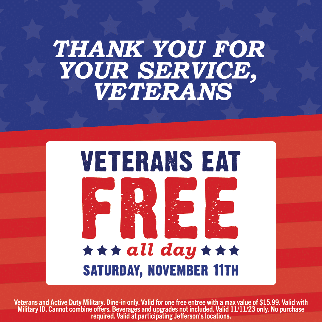 “We recognize the incredible sacrifices made by our veterans and active duty military and are delighted to extend our gratitude by offering a meal on us,” said Jefferson’s President Brandon Graham. “We look forward to personally thanking them on Veteran’s Day.”